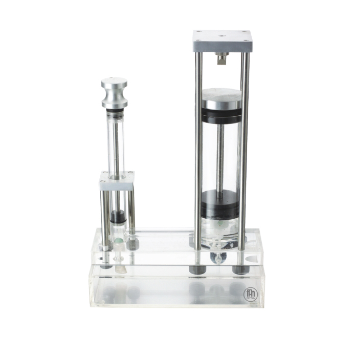 Działający model przeznaczony do demonstracji technicznych pras hydraulicznych, wykonany z przezroczystego tworzywa, dzięki czemu przedstawienie ich budowy i wyjaśnienie zasady działania staje się znacznie prostsze. Umożliwia przecinanie drewnianych elementów, tj. wykałaczka, zapałka, czy nawet miękkich drutów. Składa się z zespołu dwóch cylindrów o różnych średnicach, z tłokami, osadzonego na podstawie w postaci zbiornika prostopadłościennego wypełnionego cieczą roboczą (wodą). Mniejszy cylinder służy jako pompka; większy natomiast umieszczony jest pod płytą zwieńczającą konstrukcję, zaopatrzoną w ostrze do przecinania małych elementów. W dolnej części dużego cylindra, z przodu modelu znajduje się zawór do spuszczania cieczy roboczej.