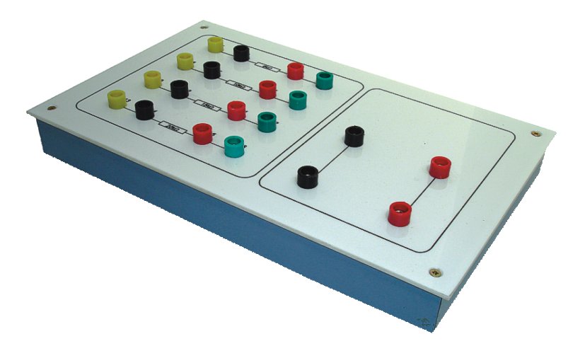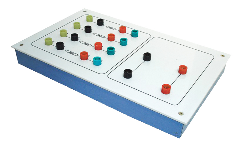 Zestaw rezystorów umieszczonych w obudowie izolacyjnej z wyprowadzeniami w postaci gniazd 4 mm. Pomoc dydaktyczna przeznaczona do ćwiczeń praktycznych dla ucznia z szeregowym, równoległym i mieszanym łączeniem rezystancji oraz do porównania otrzymanych wartości (zmierzonych za pomocą omomierza) z obliczeniami teoretycznymi. Konstrukcja układu pozwala otrzymać niemal dowolną wartość rezystancji na wyjściu w zakresie do 51kOhm, a uczeń rozwija swoje zdolności manualne w zakresie połączeń elektrycznych oraz doskonali posługiwanie się omomierzem. Zestaw zawiera rezystory o wartościach: 6, 10, 15 i 20 kOhm.