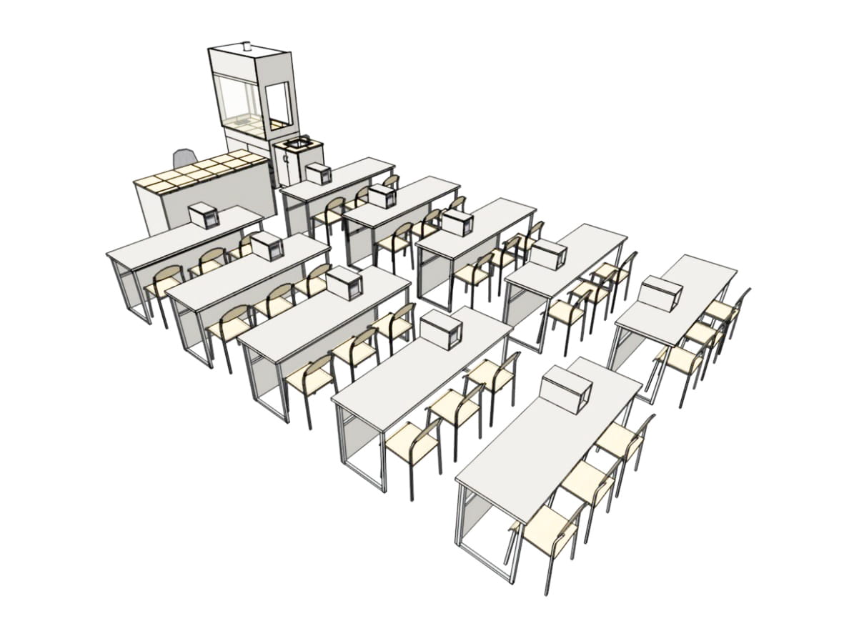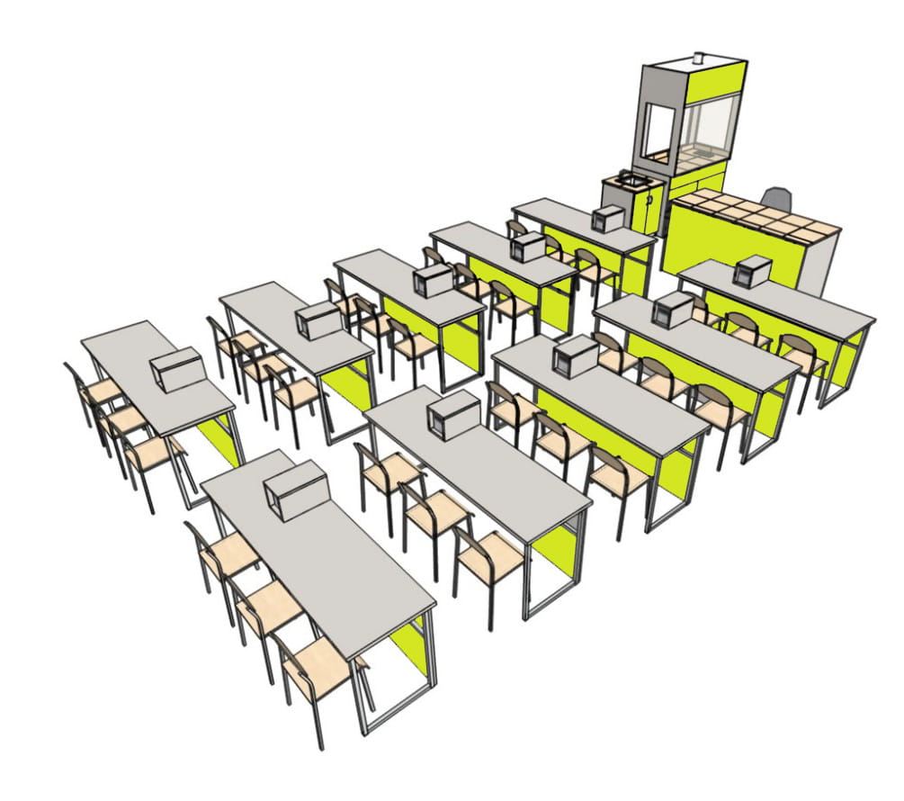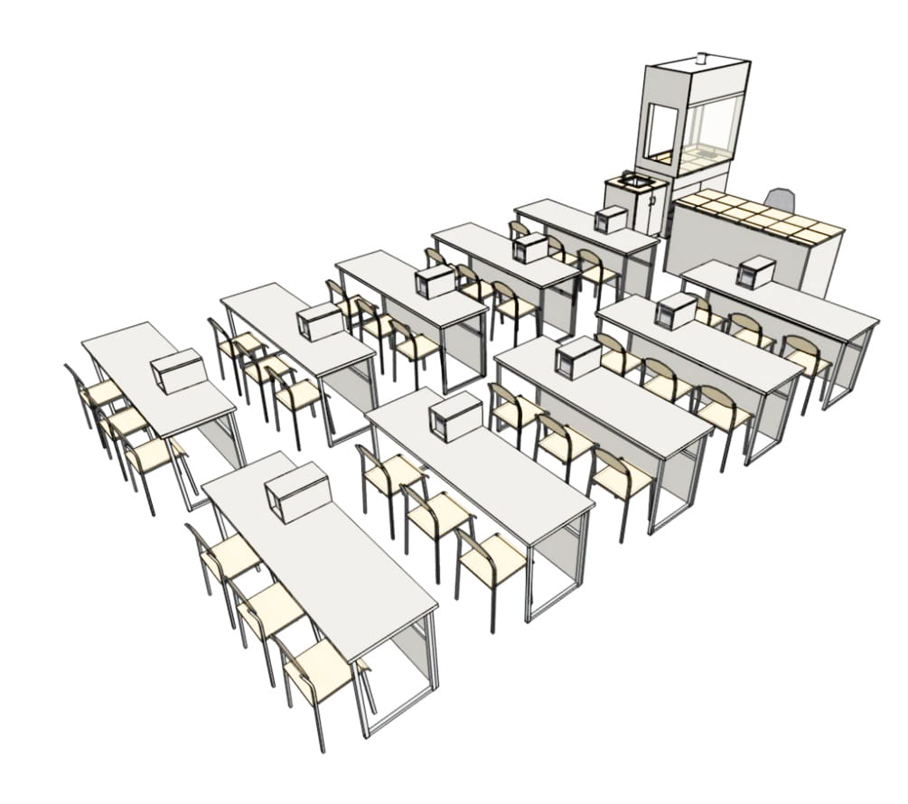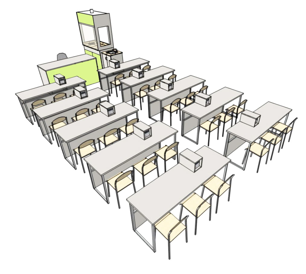 Jedną z propozycji takiej bazy doświadczalnej jest pracownia 30-os. z obudowanymi zasilaczami na stołach uczniowskich, zapewniająca zaplecze do ćwiczeń dla całej, max. 30-os. klasy.