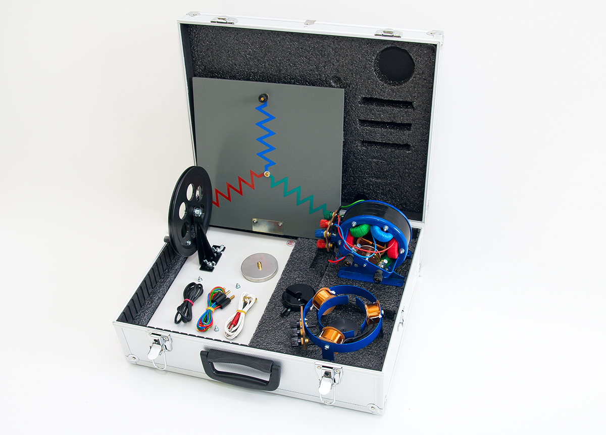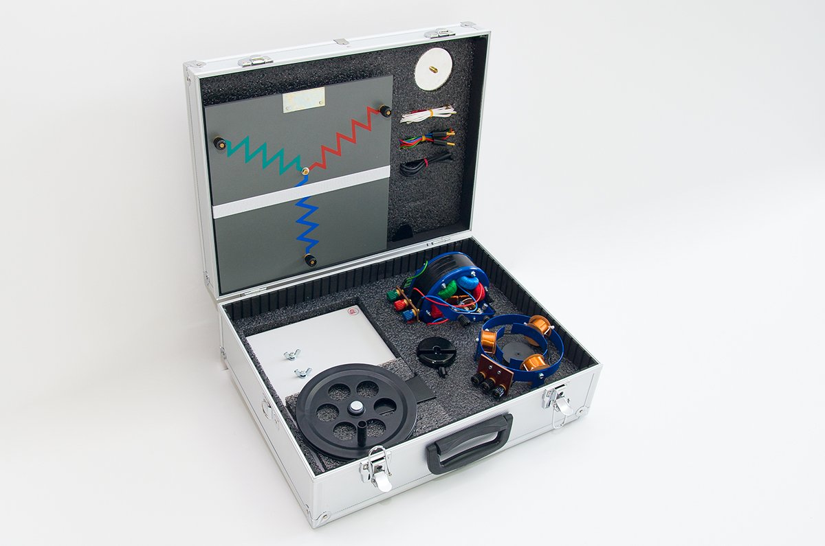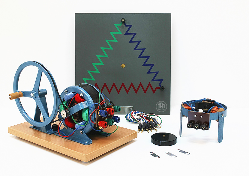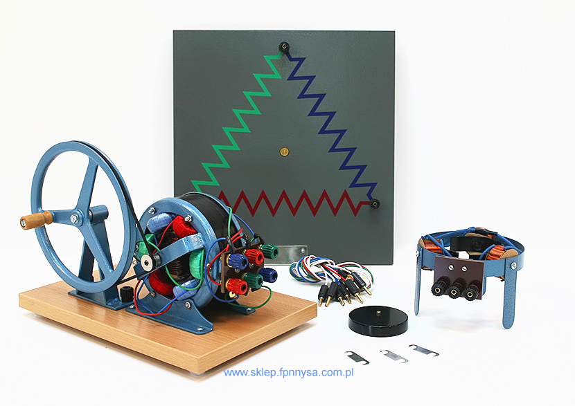 Do kompletu należy również: tablica demonstracyjna; przyrząd do pokazu wirującego pola magnetycznego; wirnik.