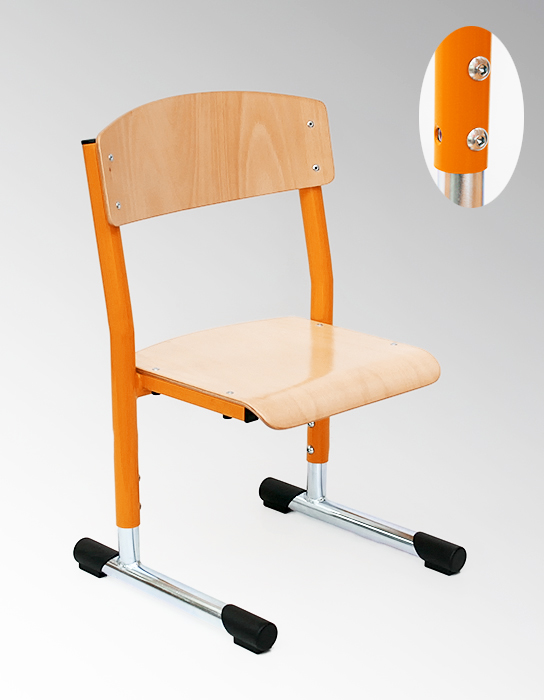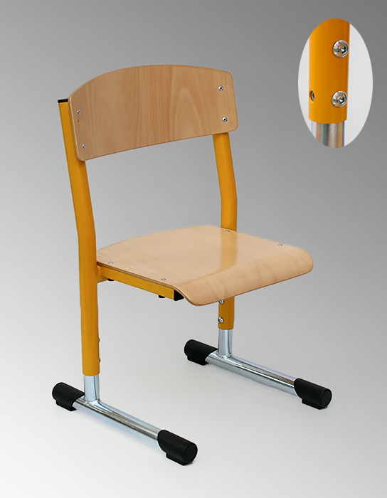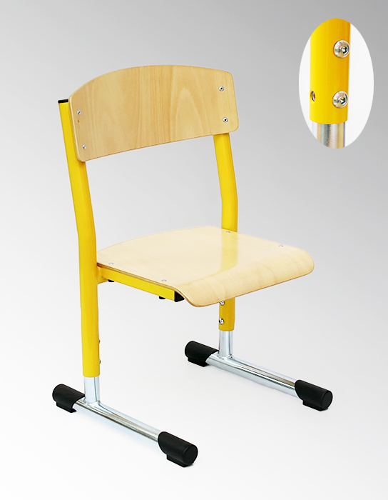 Krzesełko przedszkolne regulowane konstrukcja z rur okrągłych o średnicach 32 i 28 mm, umożliwiająca zmianę wysokości krzesła. Końce rur zabezpieczone zaślepkami z tworzywa sztucznego. Siedzisko i oparcie krzesła przedszkolnego z regulacją wykonane ze sklejki liściastej.