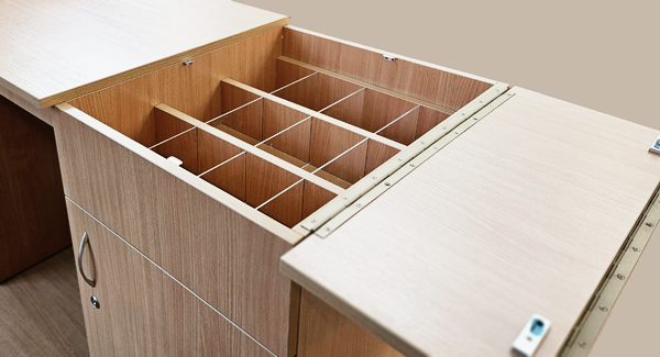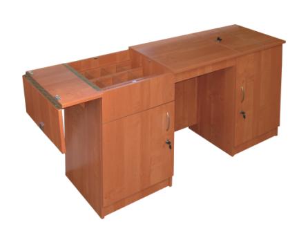 Lada 2-szafkowa do biblioteki szkolnej. Każda z szafek wyposażona jest w półkę oraz umieszczone w górnej części przegrody na kartoteki, zamykane blatem "łamanym". Konstrukcja lady bibliotecznej wykonana z płyty wiórowej laminowanej o grub. 18 mm, obrzeża zabezpieczone doklejką PCV. Drzwi zamykane zamkami patentowymi.