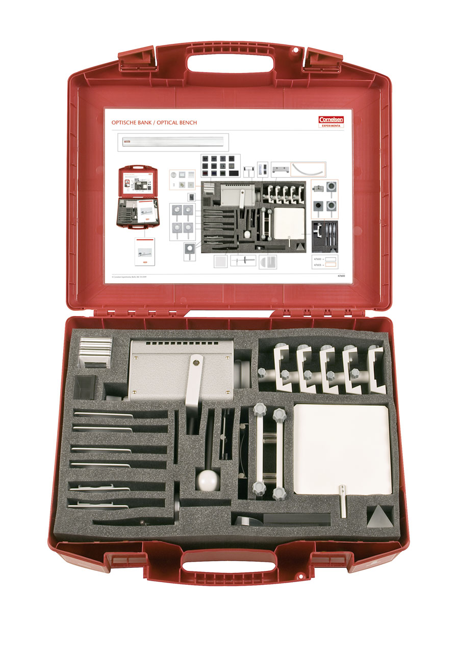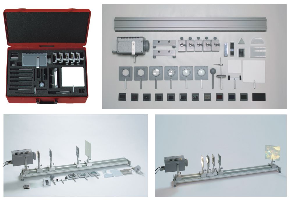 Zestaw składa się z wszystkich elementów pozwalających przeprowadzić szereg eksperymentów oraz demonstracji z zakresu optyki, soczewek, pryzmatów oraz luster.