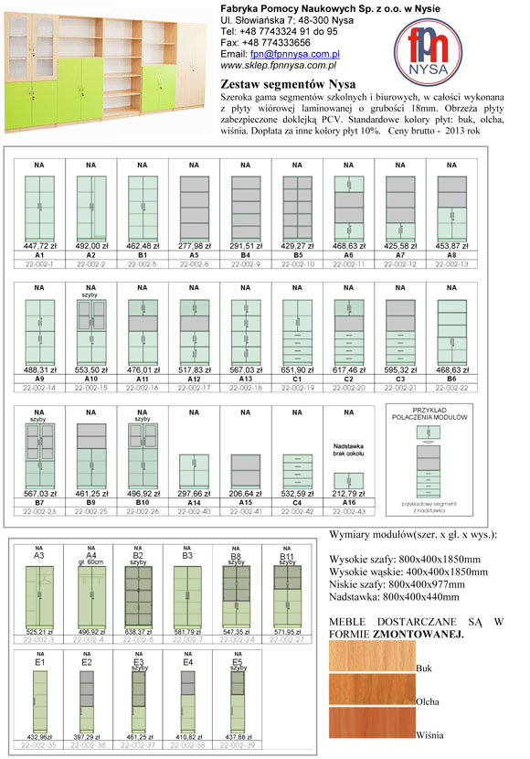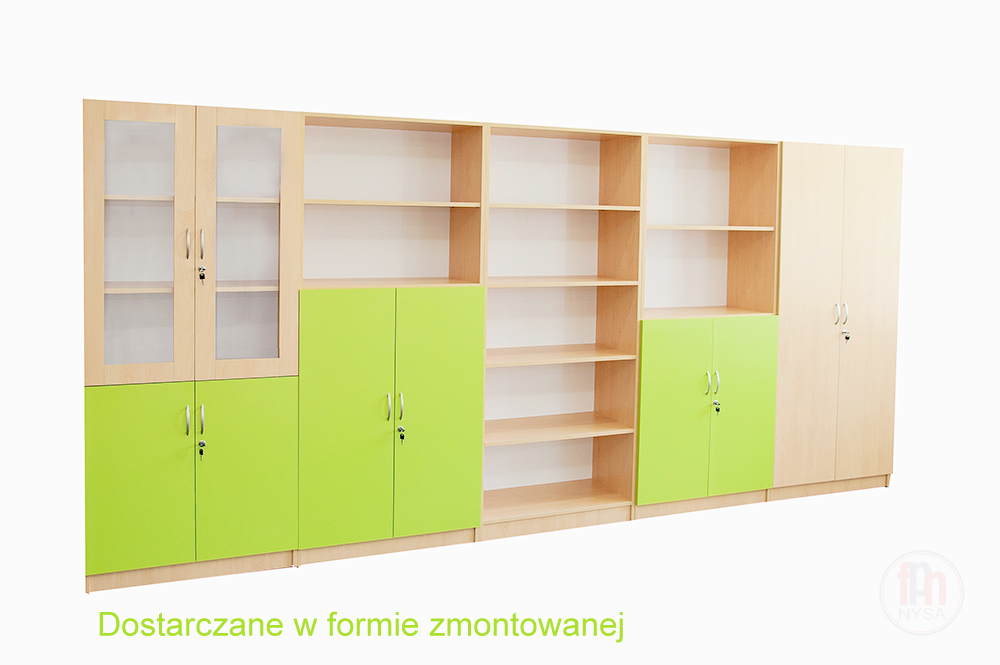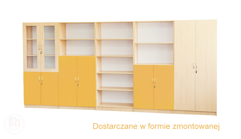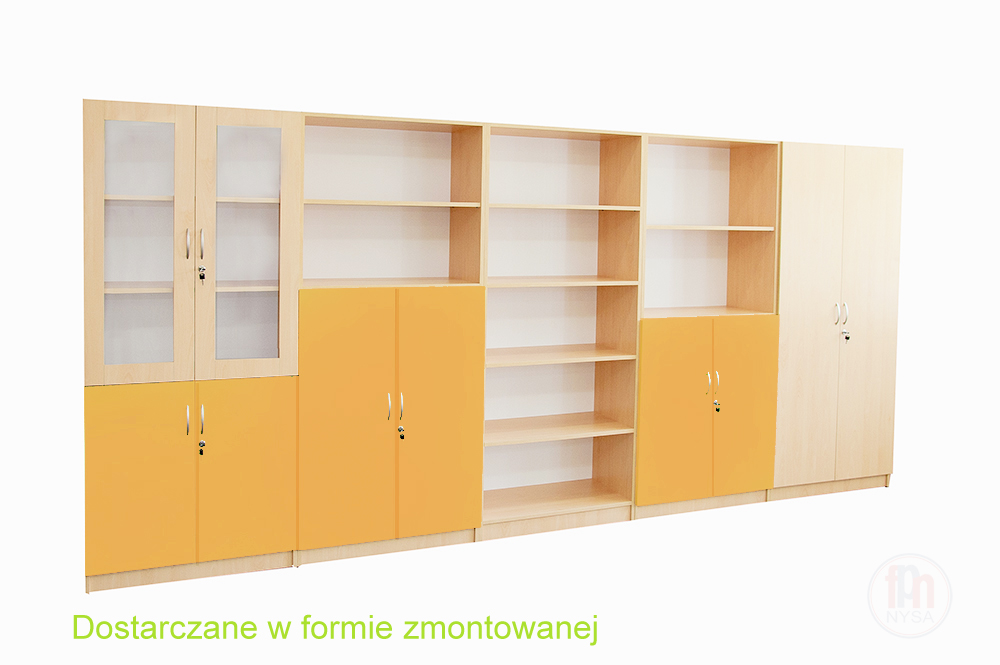 Meble szkolne z płyty meblowej z grupy mebli szkolnych skrzyniowych NYSA. Konstrukcja z płyty meblowej o grub. 18 mm, obrzeża zabezpieczone doklejką PCV. Moduły szkolne dostępne indywidualnie umożliwiają wybór dowolnego zestawienia idealnego do wyposażenia pracowni szkolnych różnego typu, sal lekcyjnych, pokojów nauczycielskich, jak również pomieszczeń biurowych i socjalnych.