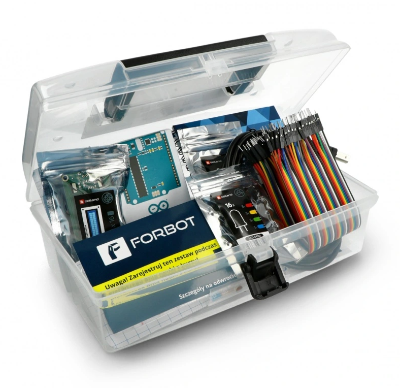 Zestaw składa się z modułu - płytki głównej Arduino Uno oraz podstawowych elementów elektronicznych: płytkę stykową, wyświetlacz LCD ze złączami, diody, przewody, rezystory i wiele innych. Na bazie tych kompnentów zestawu prowadzony jest darmowy kurs Arduino dostępny na forum Forbot.pl.