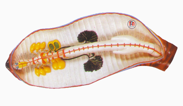 Model dżdżownicy z otwartym płaszczem mięśniowo-skórnym. Dokładnie obrazuje cechy segmentacji ciała oraz narządy wewnętrzne w trójwymiarze.