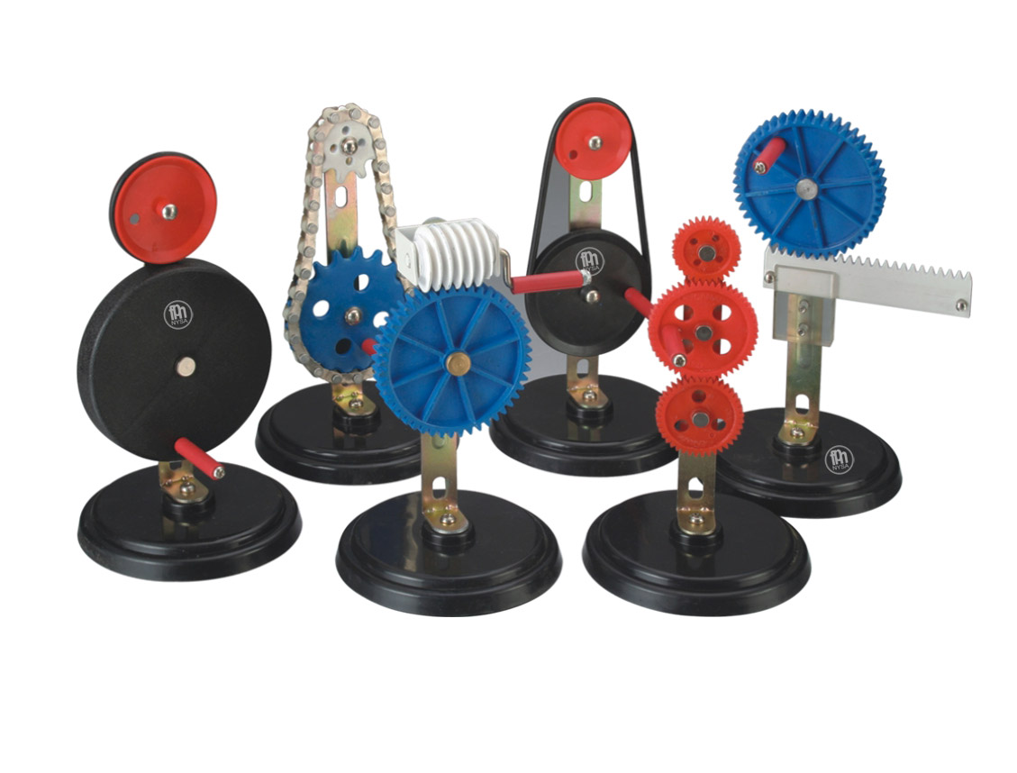 Zestaw sześciu modeli przekładni mechanicznych, wśród których znajdują się: