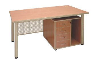 Nogi okrągłe fi 50 mm zakończone stopkami do reg. poziomu. Blat o grub 28 mm wykonany z płyty wiórowej laminowanej, obrzeże zabezpieczone doklejką PCV. Maskownica perforowana. Standardowo wyposażony w kontener z 4 szufladami zamykanymi zamkiem centralnym oraz półkę otwartą pod jednostkę centralną komputera.