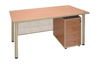 Nogi okrągłe fi 50 mm zakończone stopkami do reg. poziomu. Blat o grub 28 mm wykonany z płyty wiórowej laminowanej, obrzeże zabezpieczone doklejką PCV. Maskownica perforowana. Wyposażony w kontener 4-szufladowy z zamkiem centralnym.