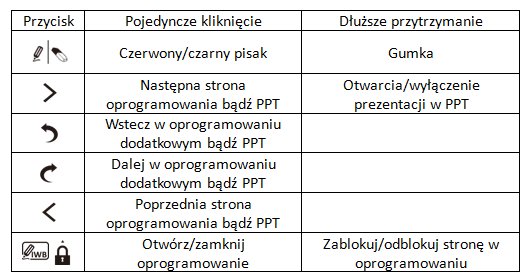 Inteligentny pisak posiada 6 przycisków funkcyjnych, dzięki którym staje się bardzo przydatny w pracy nauczyciela bądź ucznia. Można wykorzystać go do zdalnego zarządzania np. plikami PPT (PowerPoint).