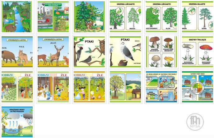 - osiemnaście kolorowych plansz formatu A3, zafoliowanych obustronnie, jednorodnych graficznie, podzielonych na cztery tematy kompleksowe; możliwość wykorzystania plansz w dowolnych kombinacjach według potrzeb;