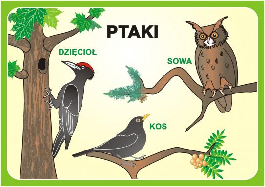 PLANSZA VII - Ptaki – kos, dzięcioł, sowa