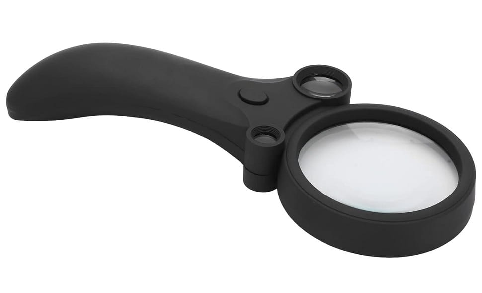 Podświetlana lupa o średnicy 65mm i powiększeniu x2.5. Wyposażona jest w dwie dodatkowe soczewki x25 i x55 oraz światło UV. Lupa posiada 4 diody szerokokątne - przełącznik umieszczony w rękojeści, które oświetlają przedmioty obserwowane pod poszczególnymi soczewkami. Centralna dioda emituje świtało ultrafioletowe.