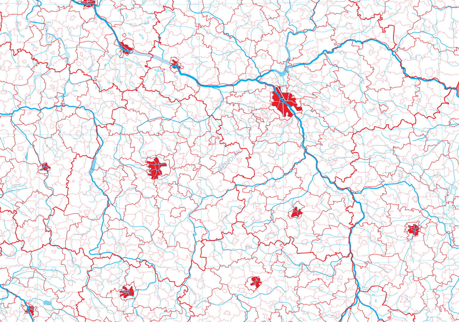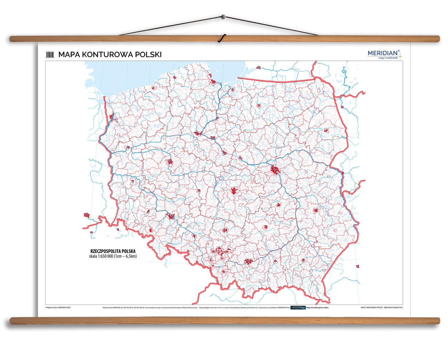 Ścienna mapa szkolna do ćwiczeń zawierająca konturowe obrysy granic administracyjnych (państwa,województwa, powiaty i gminy) oraz sieć hydrograficzną Polski. Zaznaczono także konturem zabudowy miasta powyżej 100 000 mieszkańców. Podstawowa mapa na wyposażeniu każdej pracowni geograficznej.