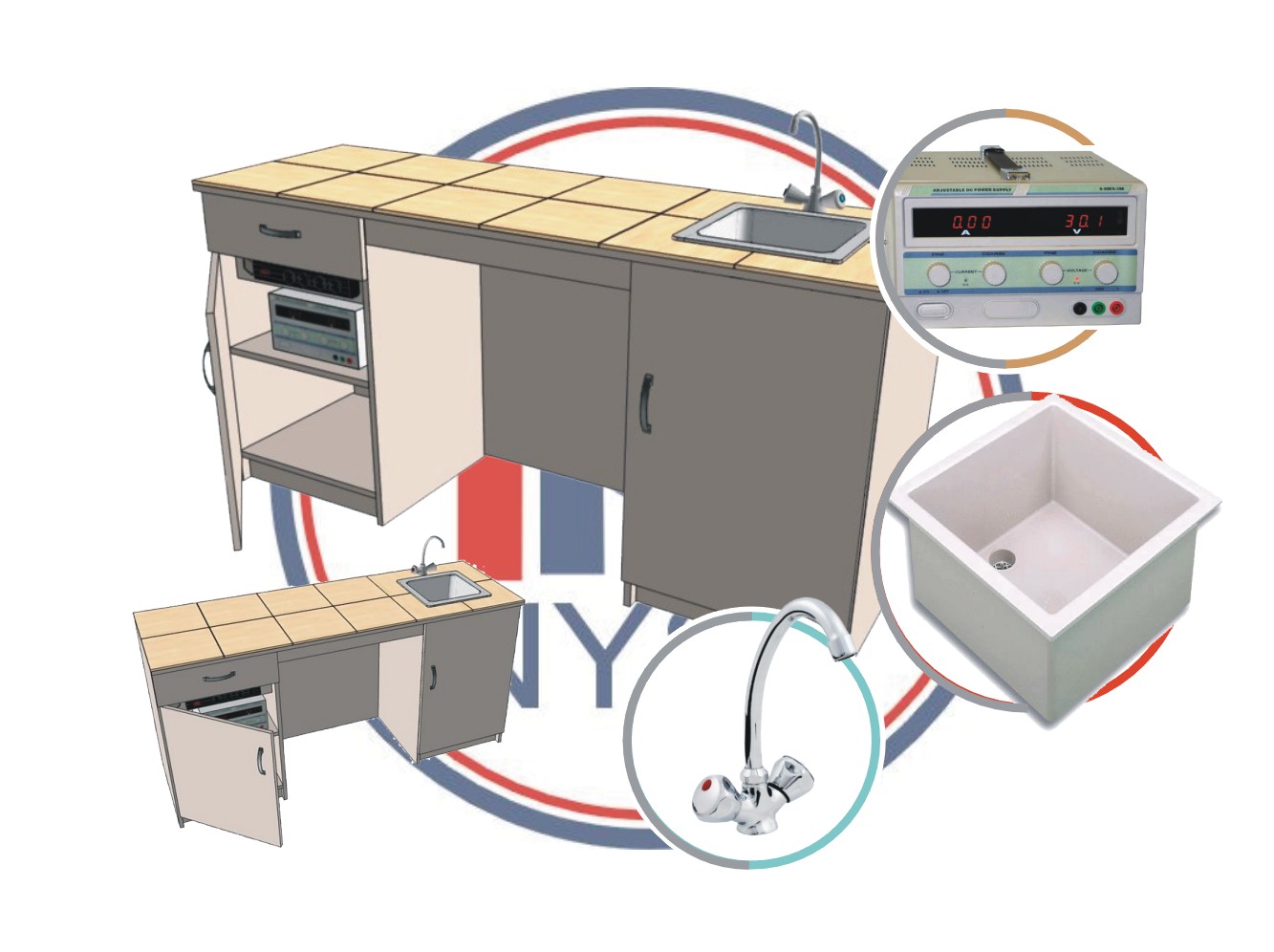 Stanowisko demonstracyjne 2-szafkowe na bazie płyty melaminowej laminowanej obustronnie, z obrzeżami zabezpieczonymi doklejką PCV. Blat pokryty płytkami ceramicznymi spełnia wymogi pracowni fizyko chemicznych i chemicznych, wykazując odporność na wilgoć, temperaturę i substancje chemiczne. Wyposażone w zlew polipropylenowy (chemoodporny) o wymiarach wewnętrznych 300x 300 x 200mm, dostarczany z syfonem oraz baterię nablatową 2-kurkową; posiada przedłużacz 4-gniazdowy montowany w szafce pod blatem oraz zasilacz laboratoryjny dużej mocy będący w stanie zaspokoić zapotrzebowanie zarówno nauczyciela, jak i grup uczniowskich na zajęciach praktycznych w laboratorium (zasilanie stolików uczniowskich wyceniane jest indywidualnie, po ocenie możliwości technicznych danej pracowni). Dwie szafki, w tym jedna z szufladą zamykane są zamkami patentowymi.