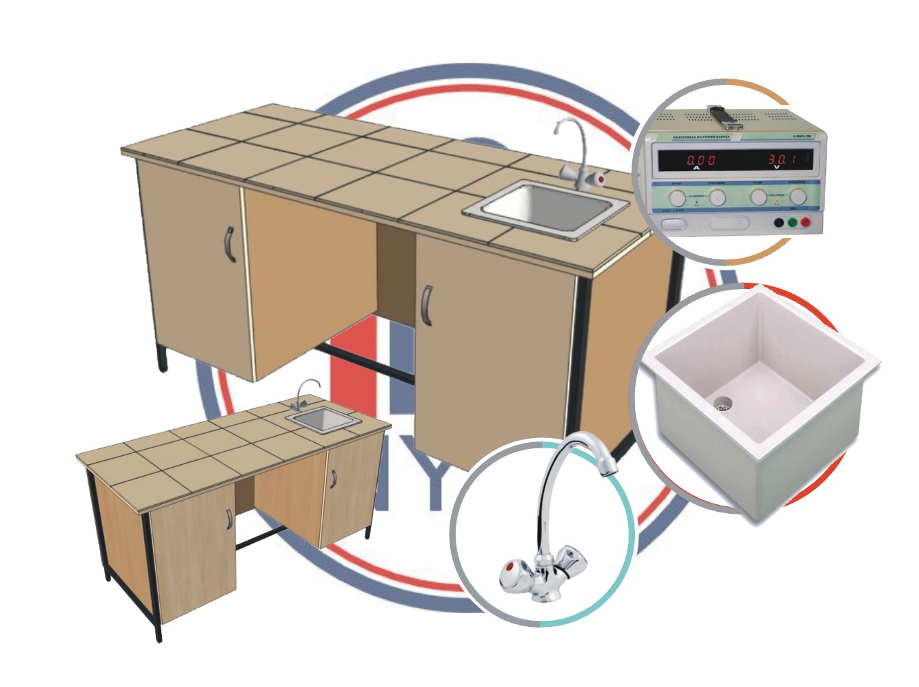 Stanowisko demonstracyjne 2-szafkowe na stelażu metalowym z kształtownika o profilu kwadratowym 25x25. Konstrukcja skrzyniowa na bazie płyty melaminowej laminowanej obustronnie, z obrzeżami zabezpieczonymi doklejką PCV. Blat pokryty płytkami ceramicznymi spełnia wymogi pracowni fizyko chemicznych i chemicznych, wykazując odporność na wilgoć, temperaturę i substancje chemiczne. Wyposażone w zlew polipropylenowy (chemoodporny) o wymiarach wewnętrznych 300x 300 x 200mm, dostarczany z syfonem oraz baterię nablatową 2-kurkową; posiada przedłużacz 4-gniazdowy montowany w szafce pod blatem oraz zasilacz laboratoryjny dużej mocy będący w stanie zaspokoić zapotrzebowanie zarówno nauczyciela, jak i grup uczniowskich na zajęciach praktycznych w laboratorium (zasilanie stolików uczniowskich wyceniane jest indywidualnie, po ocenie możliwości technicznych danej pracowni). Dwie szafki, z których jedna wyposażona jest w dwie półki, zamykane są zamkami patentowymi.