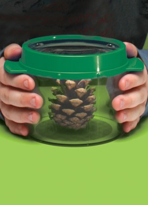 Zestaw pozwala oglądać w powiększeniu gatunki znalezione podczas wycieczek na łono natury. Dzięki umieszczonej na spodzie pojemnika siatce milimetrowej można w łatwy sposób wymiarować przedstawiciela danego gatunku. Zestaw zawiera również stojak pozwalający wykorzystać pokrywkę pojemnika, jako samodzielnie stojące szkło powiększające. Powiększenie soczewki - 2,3x.