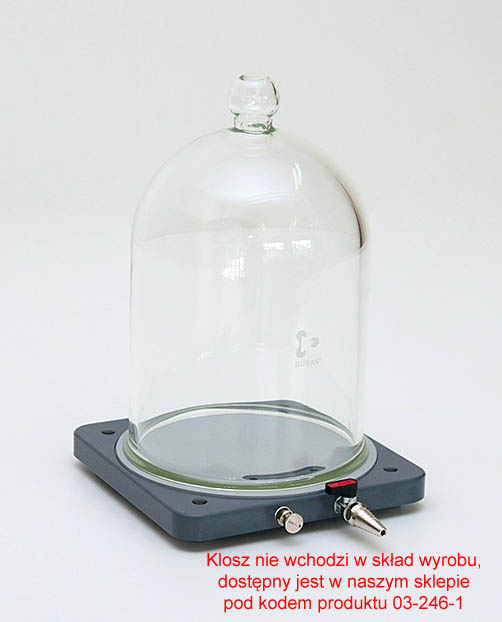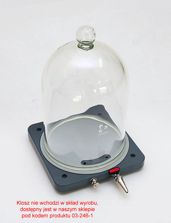 Podstawa w połączeniu ze szklanym kloszem Nr 03-246-1 używana jest do prezentacji doświadczeń z niskimi ciśnieniami. Wykonana z PCV, posiada łącznik z zaworem do pompy próżniowej oraz zawór śrubowy do napełniania.