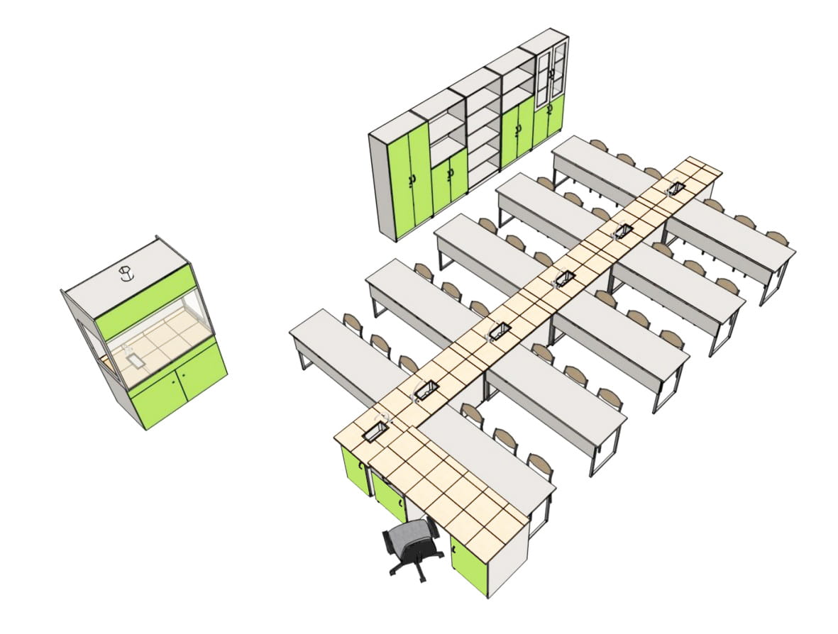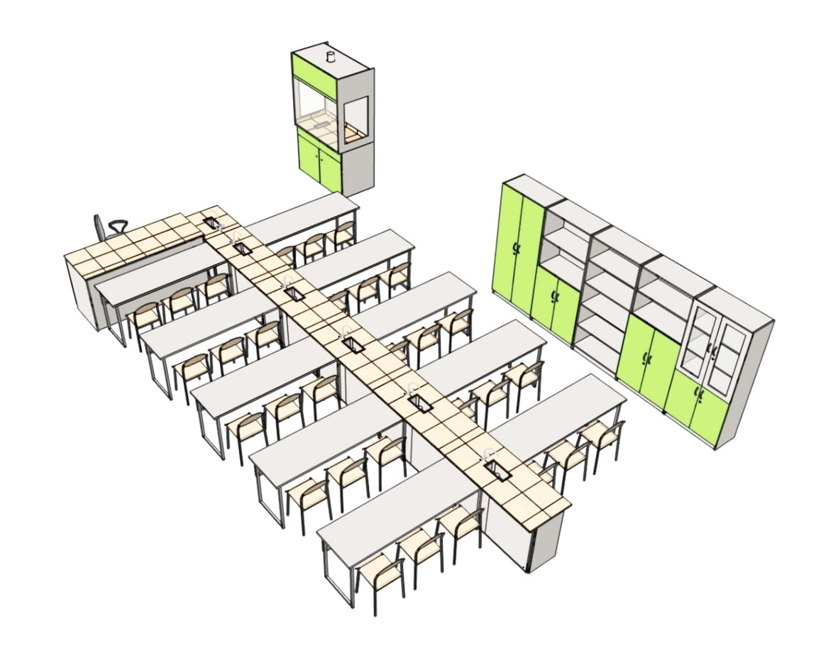 Wersja pracowni z kanałem środkowym zaopatrzonym w media, stanowi bazowe rozwiązanie dla szkół, dzięki któremu uczniowie mają możliwość przeprowadzania doświadczeń z zakresu chemii, fizyki, biologii na swoich stanowiskach uczniowskich .