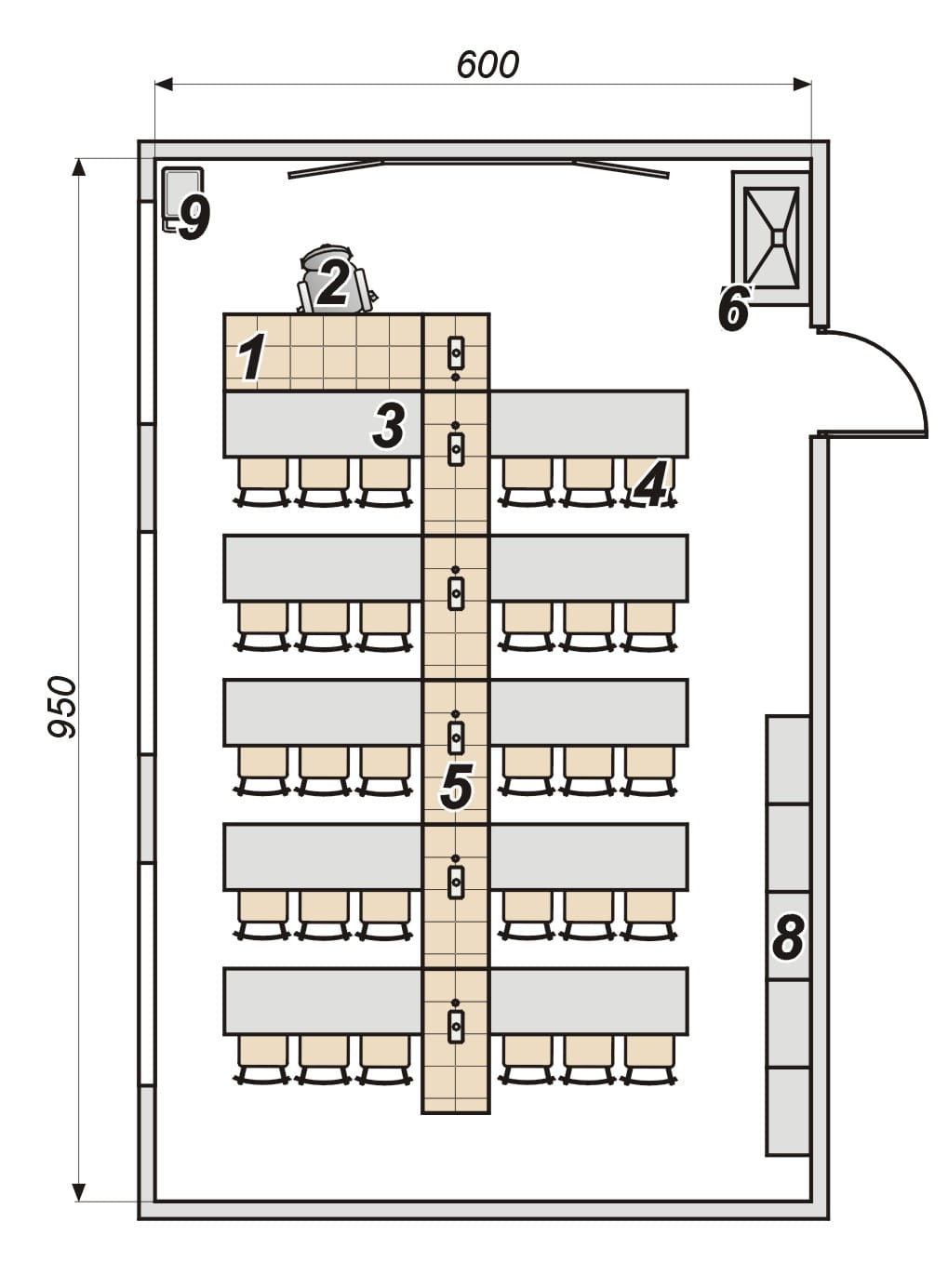5. Kanał zasilający /moduły środkowe – kanał do prowadzenia mediów (woda), złożony z 5 modułów uczniowskich i 1 modułu dla nauczyciela, każdy wyposażony w zlew chemoodporny PP 300x150 mm oraz w baterię 1-kurkową do wody. Konstrukcja stała, spawana, na bazie kształtownika o przekroju kwadratowym 25x25 mm, obudowana płytą laminowaną zabezpieczoną doklejką PCV. Blat pokryty płytkami ceramicznymi. Szerokość kanału: 600 mm, wys. 800 mm.