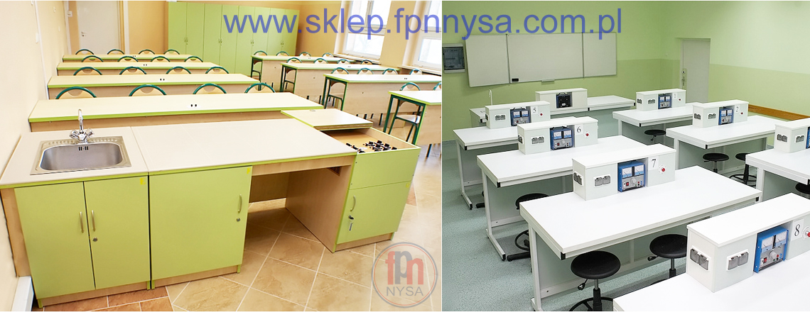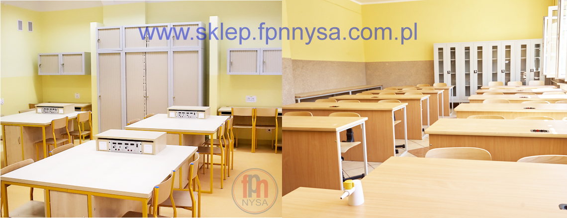 1. Stół laboratoryjny ( demonstracyjny ) 2-szafkowy NYSA z zasilaczem DC - Biurko demonstracyjne, stół demonstracyjny wyposażone jest w 2 szafki i 1 szufladę zamykane zamkami patentowymi. Posiada listwę zasilającą(przedłużacz z wyłącznikiem), zasilacz laboratoryjny prądu stałego 0-30V/5A.Blat gr. 28mm pokryty laminatem HPL