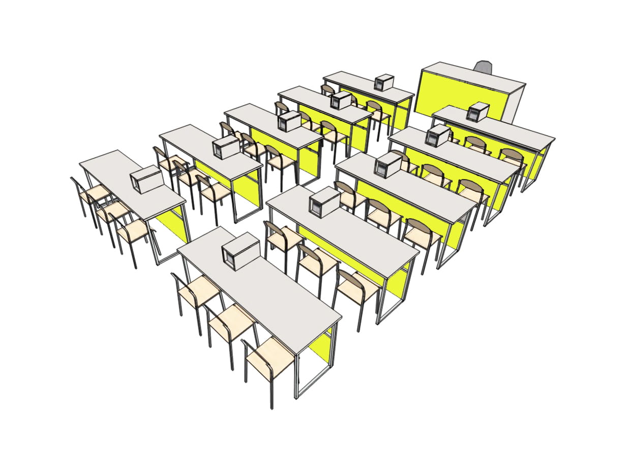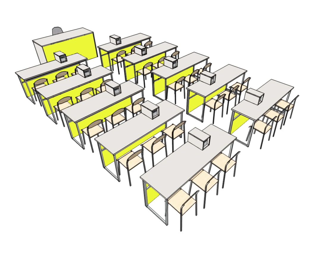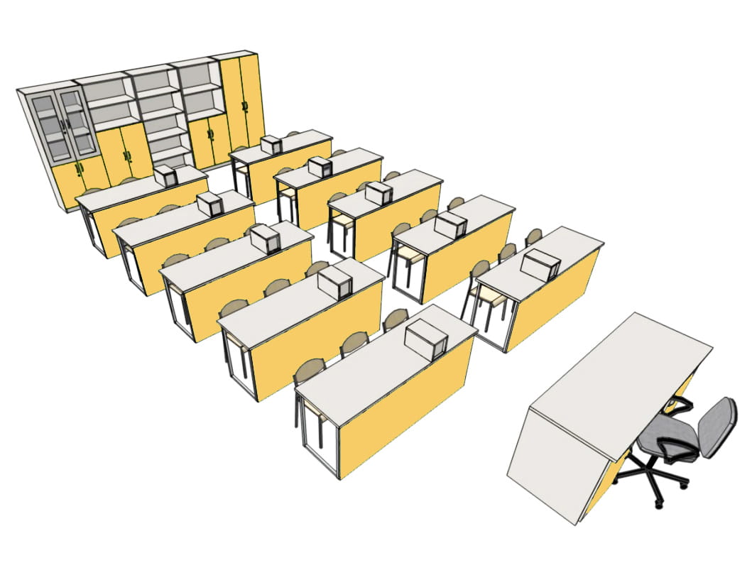 Jedną z propozycji takiej bazy doświadczalnej jest pracownia 30-stanowiskowa z zabudowanymi zasilaczami na stołach uczniowskich , zapewniająca zaplecze do ćwiczeń dla całej, max. 30-os. klasy.
