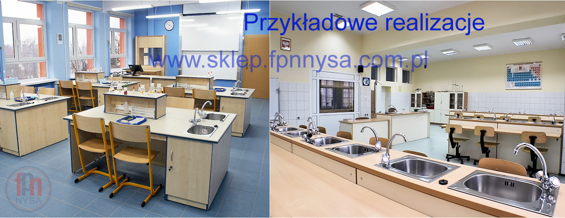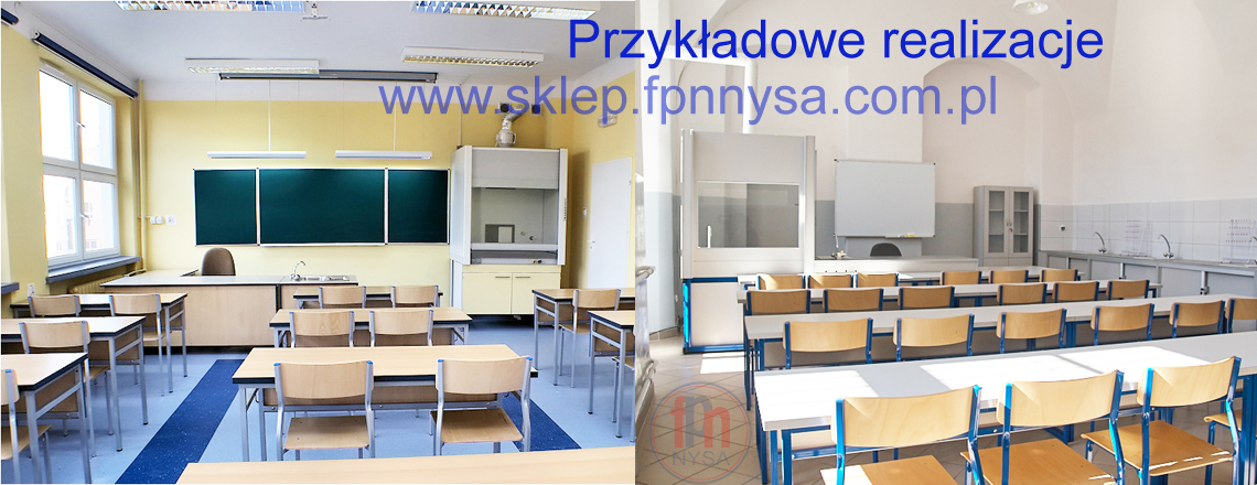 3. Stolik uczniowski NYSA 3-osobowy do pracowni fizyko-chemicznej Nr 6 (10 szt.) – solidna, stała (spawana) konstrukcja malowana proszkowo, na bazie kształtownika o profilu kwadratowym 25x25 mm z możliwością przykręcania do podłoża. Blat wykonany z płyty wiórowej gr. 28 mm pokrytej laminatem HPL. Obrzeże blatu zabezpieczone doklejką PCV gr. 2 mm. Wyposażony w maskownicę na całej długości i wysokości stołu oraz w nadstawkę z wbudowanym zasilaczem laboratoryjnym prądu stałego 0-30V/0-5A, z płynną regulacją napięcia i prądu.