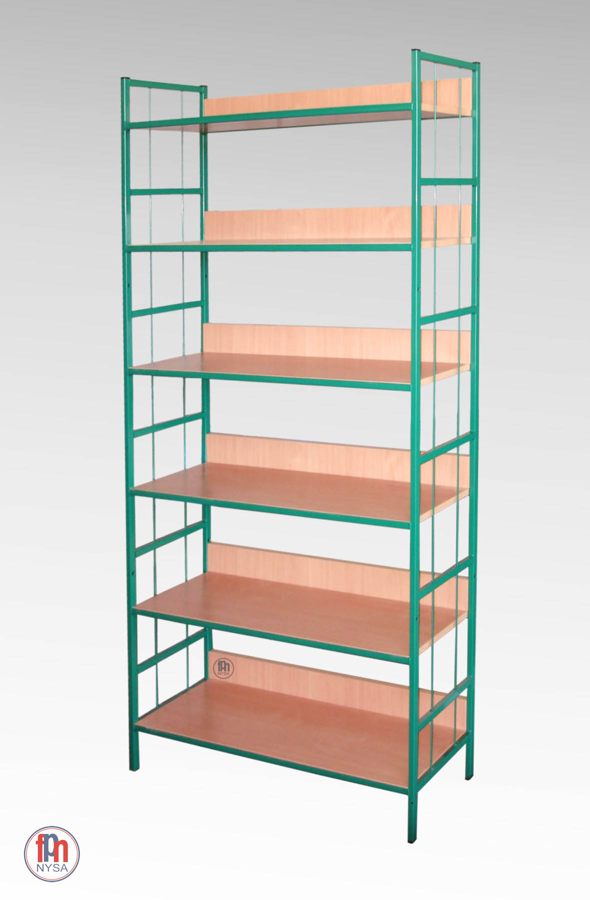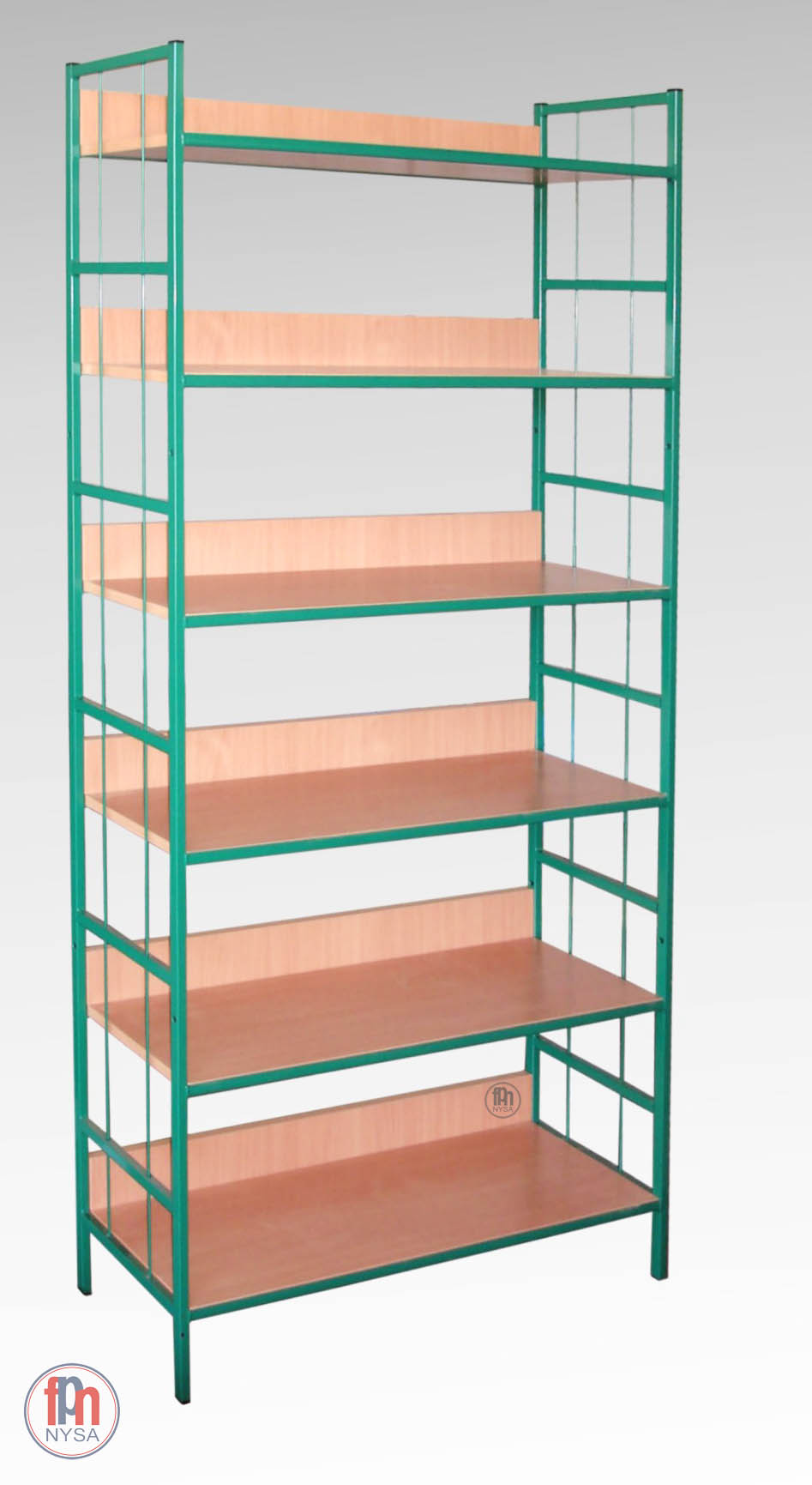 Regały biblioteczne na książki, konstrukcja nośna regałów bibliotecznych wykonana z rury kwadratowej 20x20 mm. Boki regału do biblioteki wyposażono w pionowe pręty stanowiące oparcie dla książek, zabezpieczające przed ich zsuwaniem się. Końce rur zamknięte zaślepkami z tworzywa sztucznego. Półki wykonane z płyty wiórowej laminowanej o grub. 18 mm, zabezpieczonej doklejką PCV.