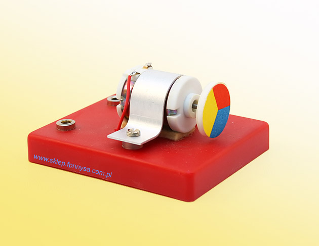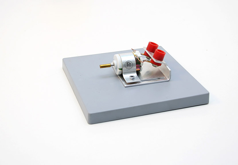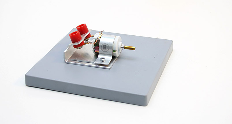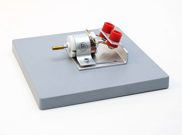 Silniczek prądu stałego umieszczony jest na podstawie z tworzywa sztucznego, wyposażonej w dwa gniazda bananowe do podłączania źródła zasilania. Może posłużyć jako element składowy przy budowie obwodów elektrycznych lub indywidualny moduł w doświadczeniach z elektrycznością. Oś silniczka dodatkowo posiada trójbarwną tarczę, ułatwiającą ocenę jego ruchu obrotowego. Do zasilania może posłużyć zarówno zasilacz prądu stałego, jak i bateria lub zestaw baterii połączonych szeregowo, o napięciu wyjściowym 4,5V.