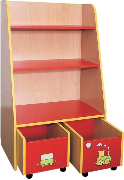 Regał z półkami do przechowywania książek i zabawek w przedszkolu, wyposażony w dwa wózki jezdne. Konstrukcja z płyty laminowanej gr. 18 mm. Obrzeże zabezpieczone doklejką PCV.