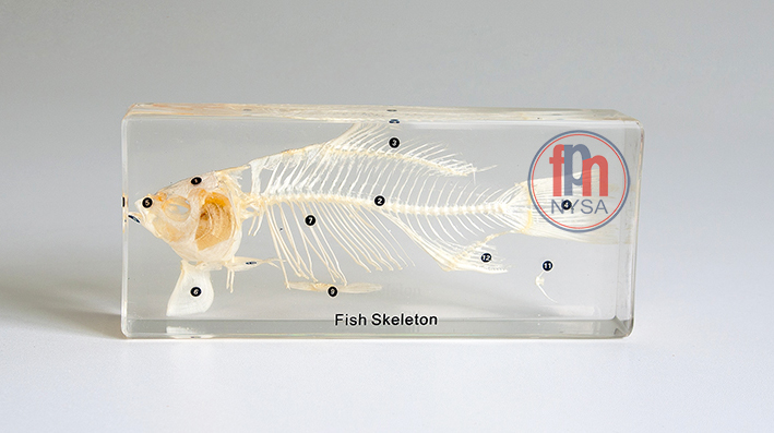 Pomoc dydaktyczna stanowi idealne uzupełnienie wyposażenia pracowni biologicznej i pracowni przyrodniczej. Pomoce edukacyjnego tego typu, tu: szkielet ryby, w idealny sposób prezentują charakterystyczne cechy budowy szkieletowej. Oznaczone są następujące elementy kośćca: czaszkę, szczękę górną i żuchwę, kręgosłup, płetwę grzbietową, płetwę ogonową, , żebra, płetwę piersiową, płetwę brzusznę, obręcz płetwy piersiowej, krąg kręgosłupa i płetwę odbytową.