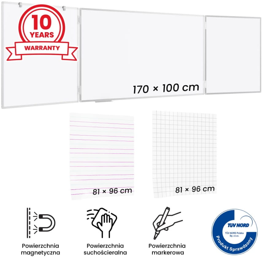 Tablica biała szkolna suchościeralna magnetyczna typu "tryptyk" 100x170 // 340 cm z NADRUKIEM kratka oraz trójlinia