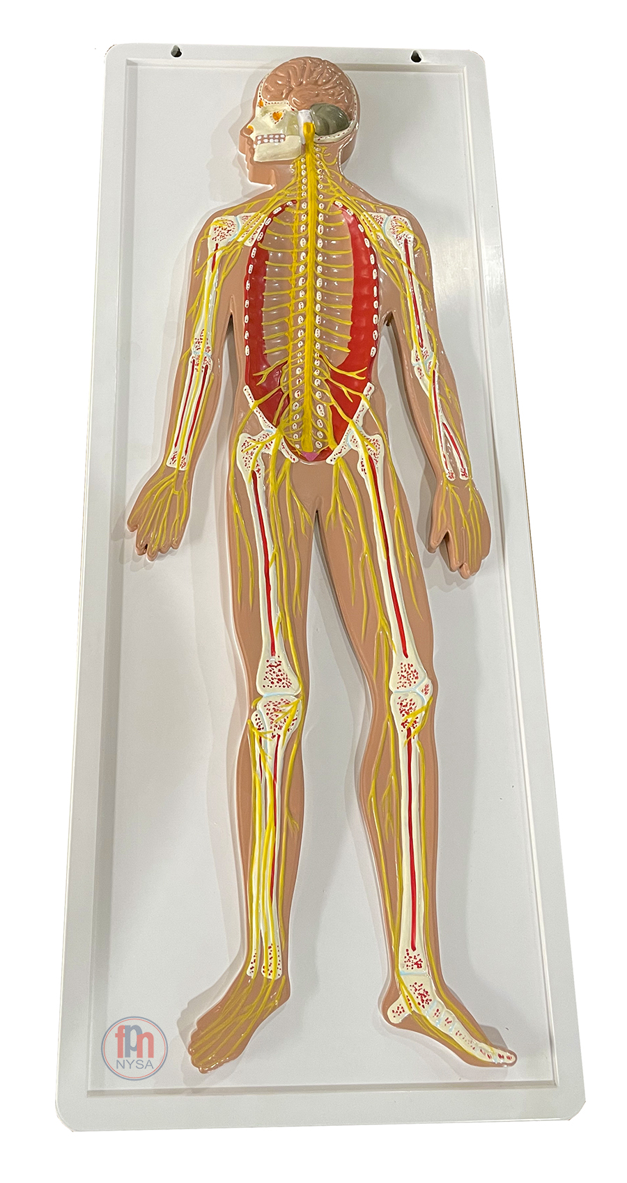 Reliefowy model układu nerwowego człowieka. Podłużny przekrój sylwetki człowieka przytwierdzony do tablicy. Pomoc dydaktyczna stanowi uzupełnienie pracowni przyrodniczej i klasopracowni biologicznej.