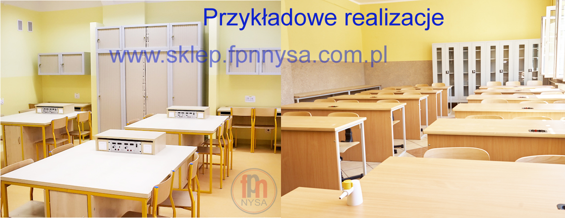 1. Stół laboratoryjny ( demonstracyjny ) 2-szafkowy NYSA z zasilaczem DC - Biurko demonstracyjne, stół demonstracyjny wyposażone jest w 2 szafki i 1 szufladę zamykane zamkami patentowymi. Posiada listwę zasilającą(przedłużacz z wyłącznikiem),. 2 zasilacze laboratoryjne prądu stałego z płynną regulacją napięcia w zakresie 0-30V/20A oraz komplet przewodów połączeniowych różnej długości. Blat gr. 28mm pokryty laminatem HPL