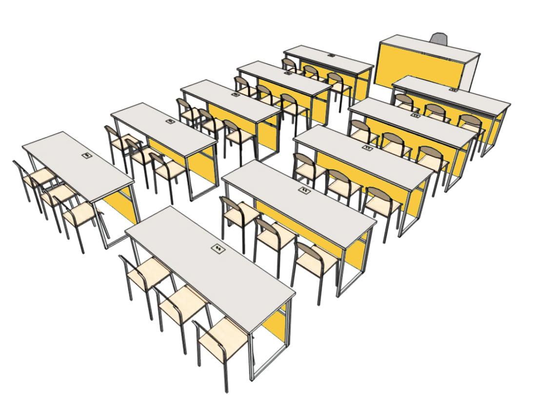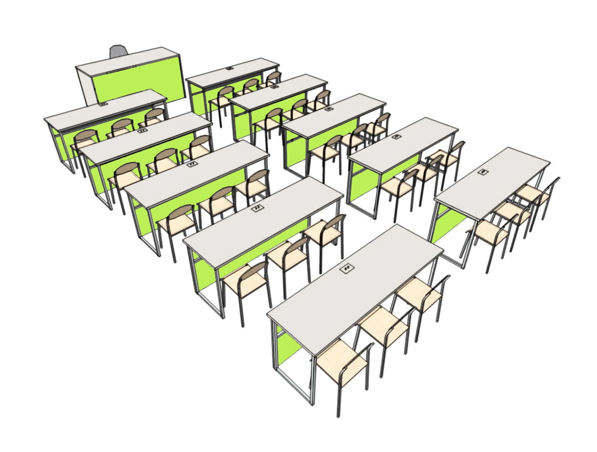 3. Stolik uczniowski NYSA 3-osobowy do pracowni fizyko-chemicznej Nr 6 (10 szt.) – solidna, stała (spawana) konstrukcja malowana proszkowo, na bazie kształtownika o profilu kwadratowym 25x25 mm z możliwością przykręcania do podłoża. Blat wykonany z płyty wiórowej gr. 28 mm pokrytej laminatem HPL. Obrzeże blatu zabezpieczone doklejką PCV gr. 2 mm. Wyposażony w maskownicę na całej długości i wysokości stołu oraz w płytkę 2-zaciskową osadzoną w blacie, do której doprowadzane jest napięcie ze stanowiska nauczyciela (0-30V/20A).